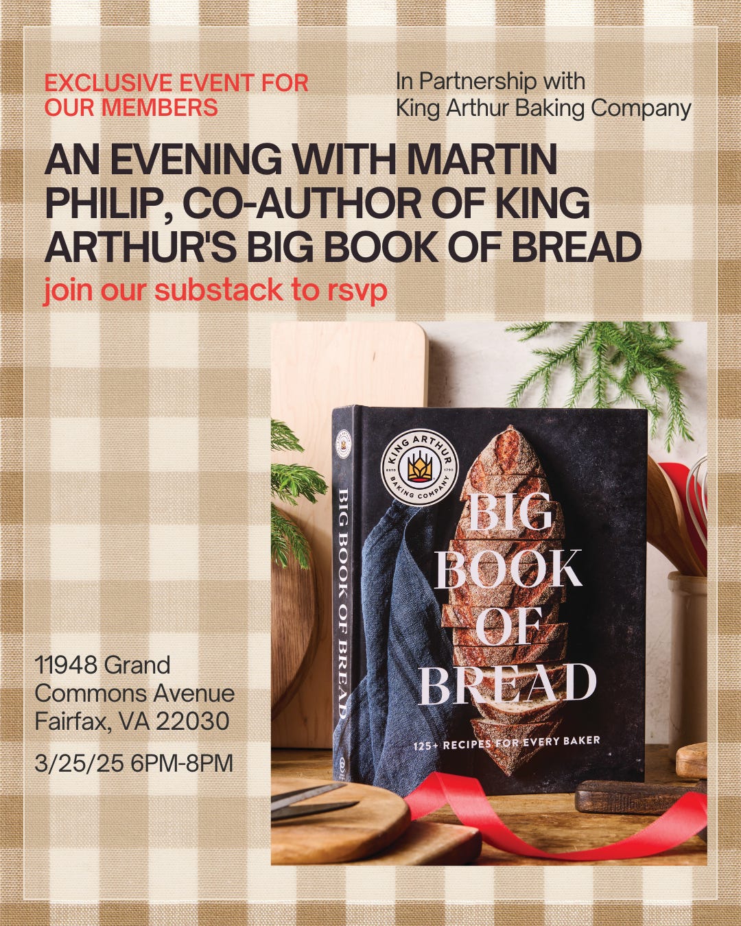 Join us for an exclusive Cookbook Courtyard members event in partnership with King Arthur Baking Company on Tuesday, March 25, from 6 to 8 p.m., featuring award-winning baker Martin Philip, co-author of King Arthur Baking’s Big Book of Bread!